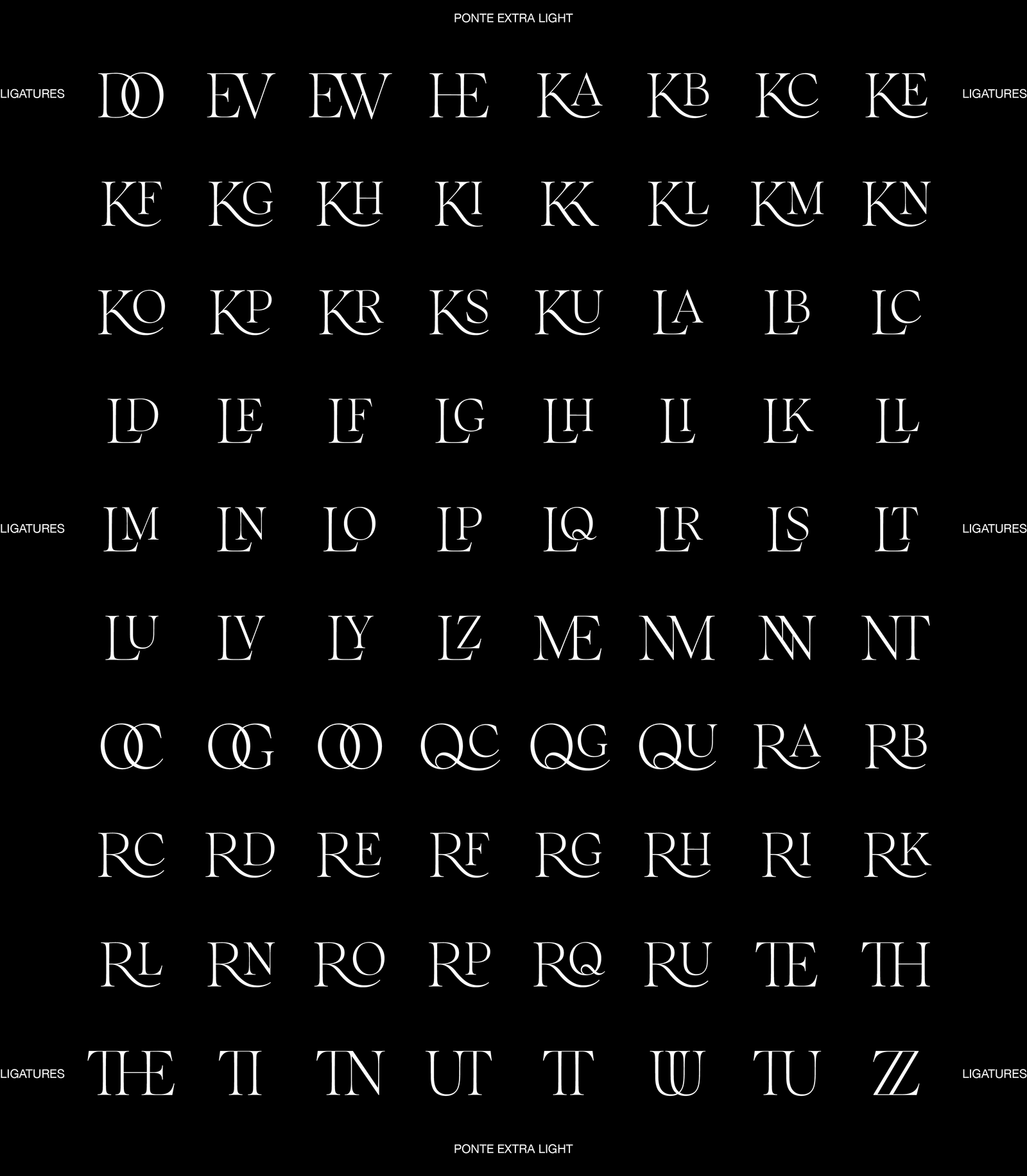 Ponte is a high-contrast display typeface with smooth serifs, designed for impactful headlines. The ten-style typeface features over 80 decorative ligatures, with roman and italics available in five weights, ranging from extra light to bold. This offers a variety of options for sophisticated design applications.